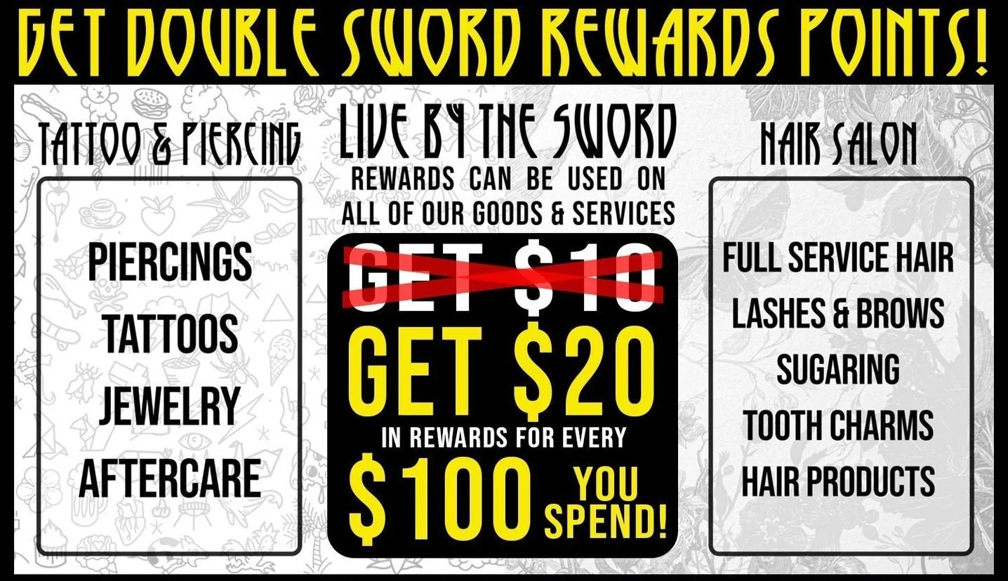 Live By The Sword offers a rich rewards program that earns you $10 in rewards for every $100 you spend.