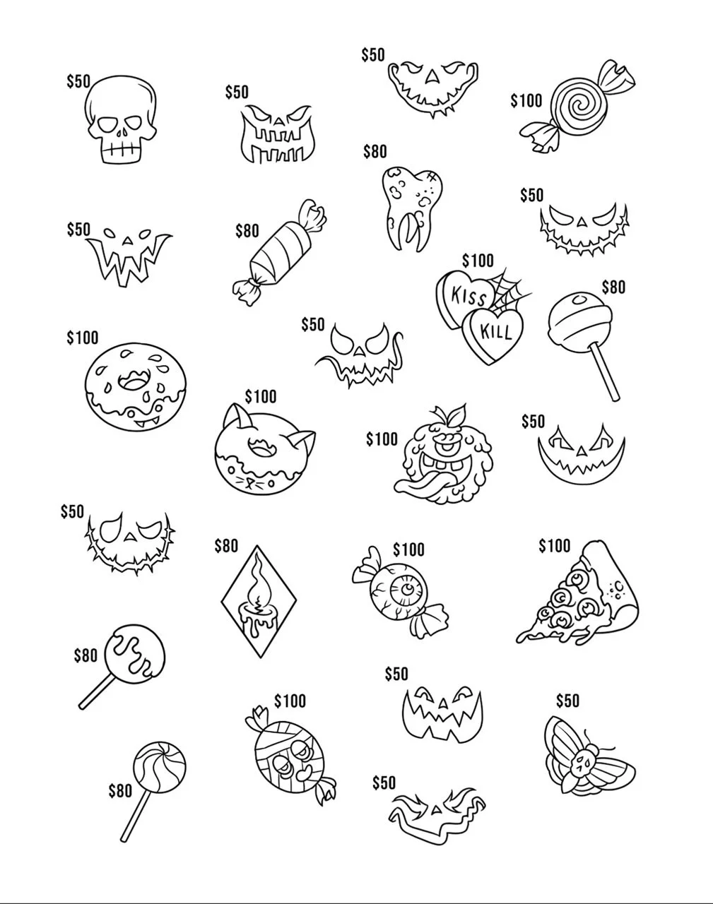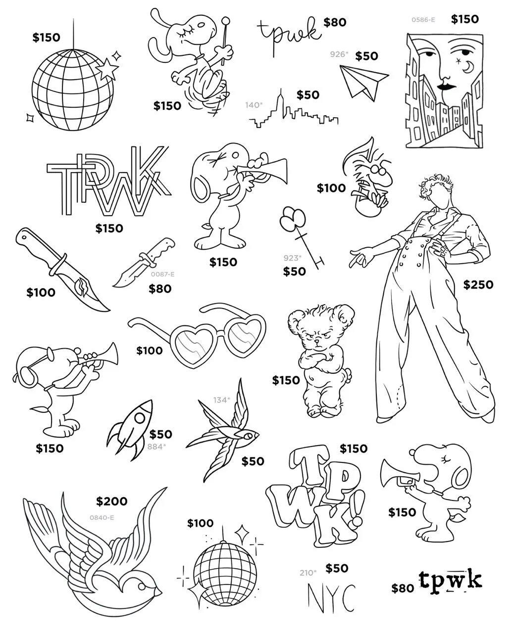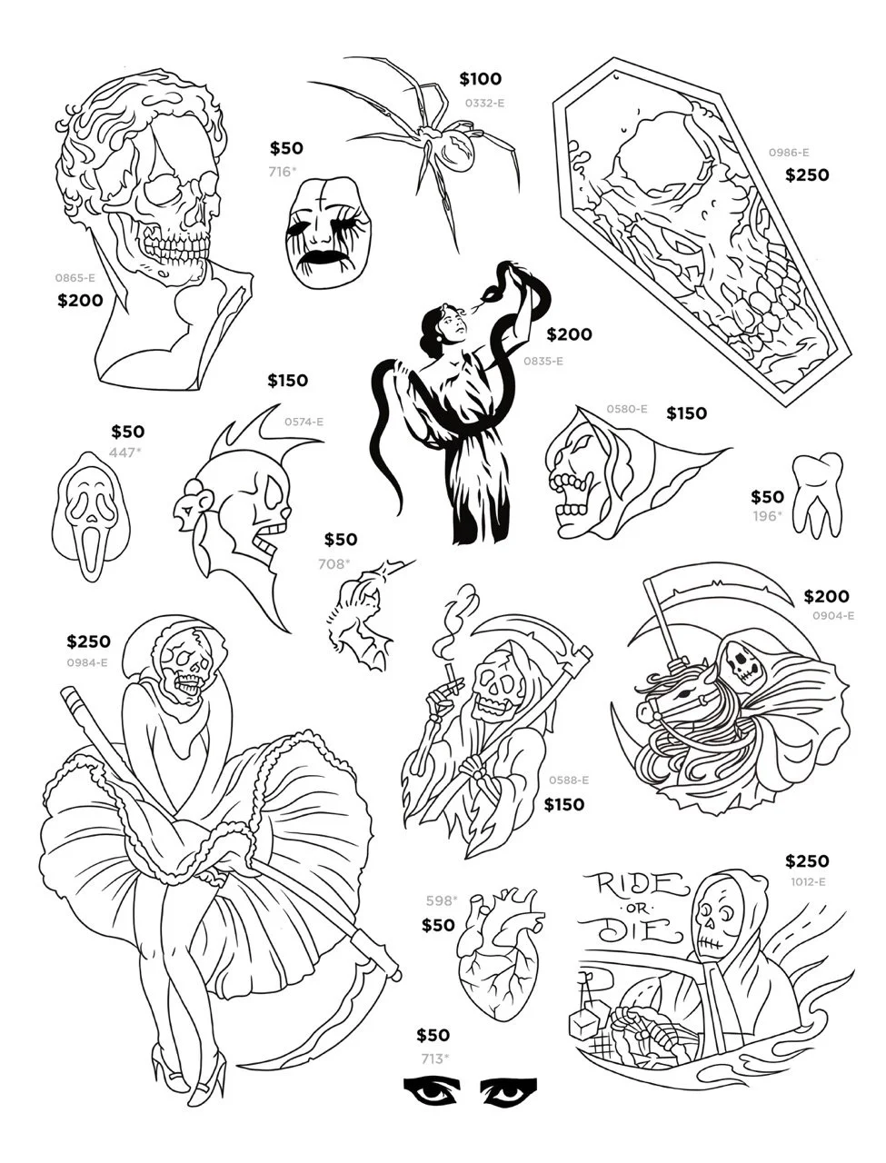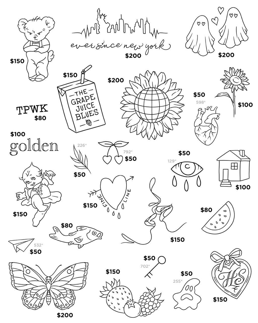 Our tattoo designs start at only $50. Choose from our selection of over 950 designs below or bring your own image of similar size and complexity. $50 tattoos are approximately one inch by one inch in black ink on arms or legs. Other areas of the body start at only $70.