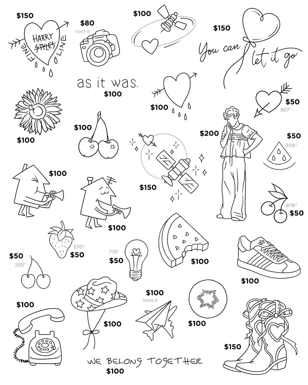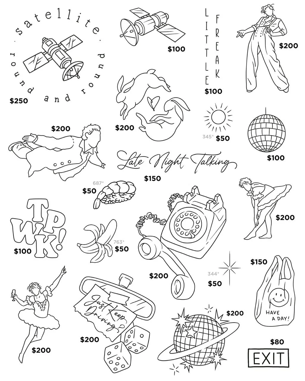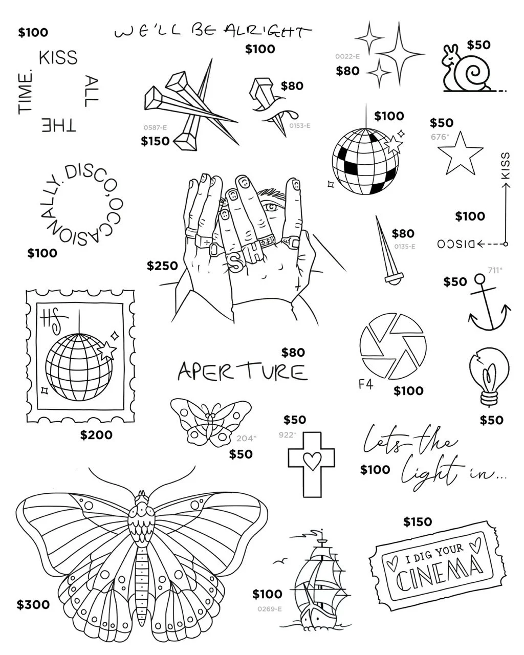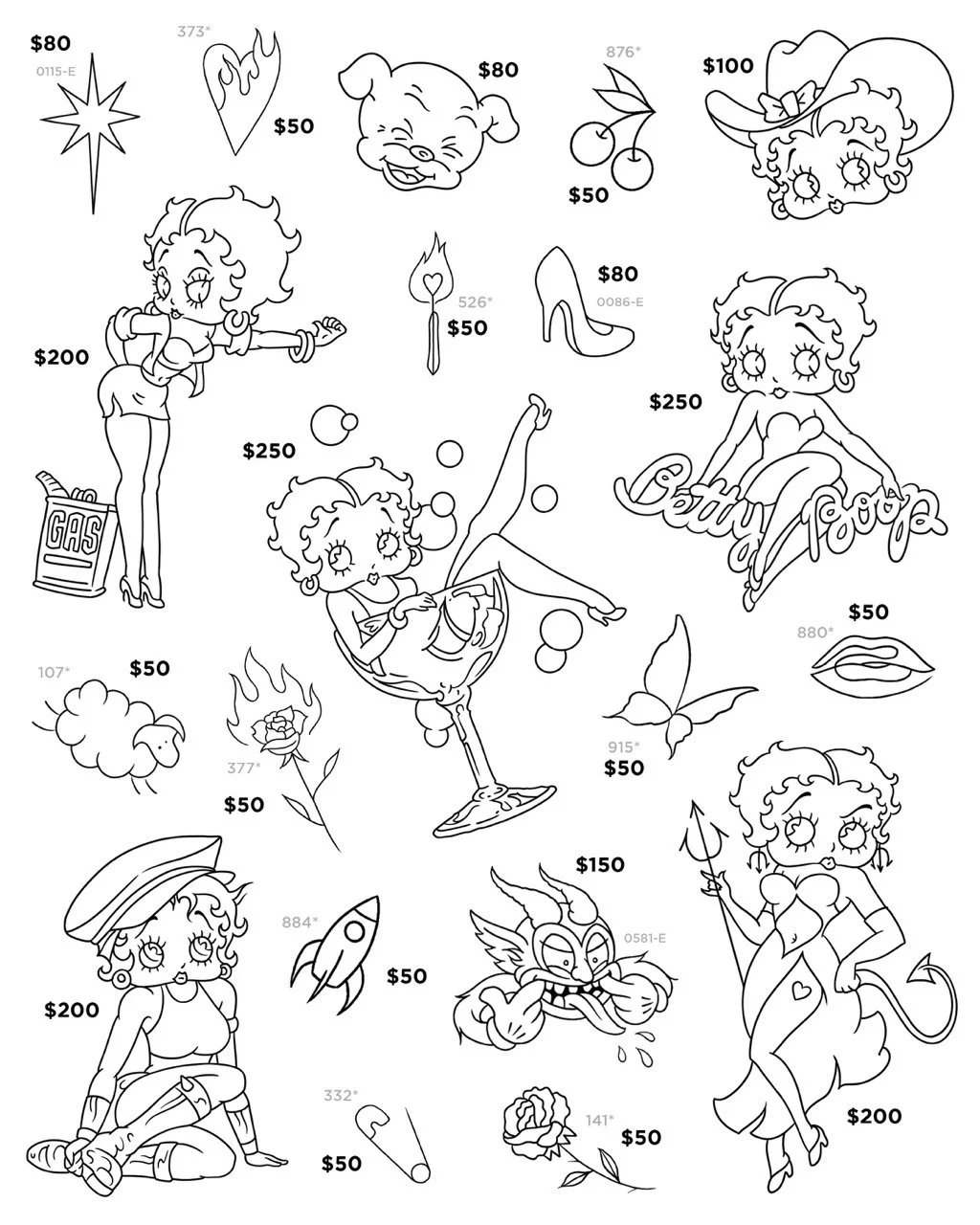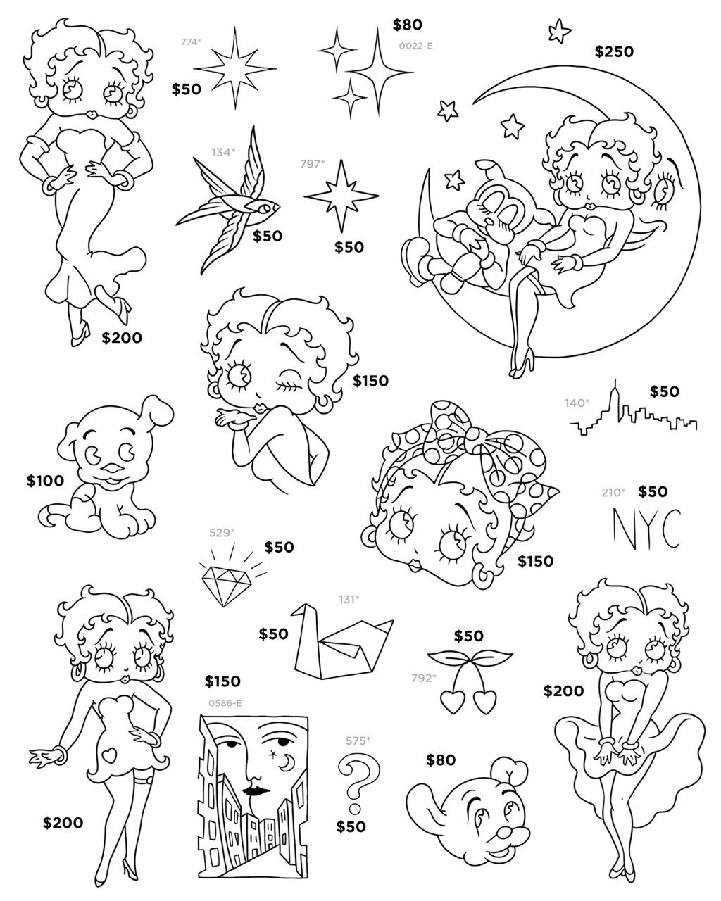 Our tattoo designs start at only $50. Choose from our selection of over 950 designs below or bring your own image of similar size and complexity. $50 tattoos are approximately one inch by one inch in black ink on arms or legs. Other areas of the body start at only $70.