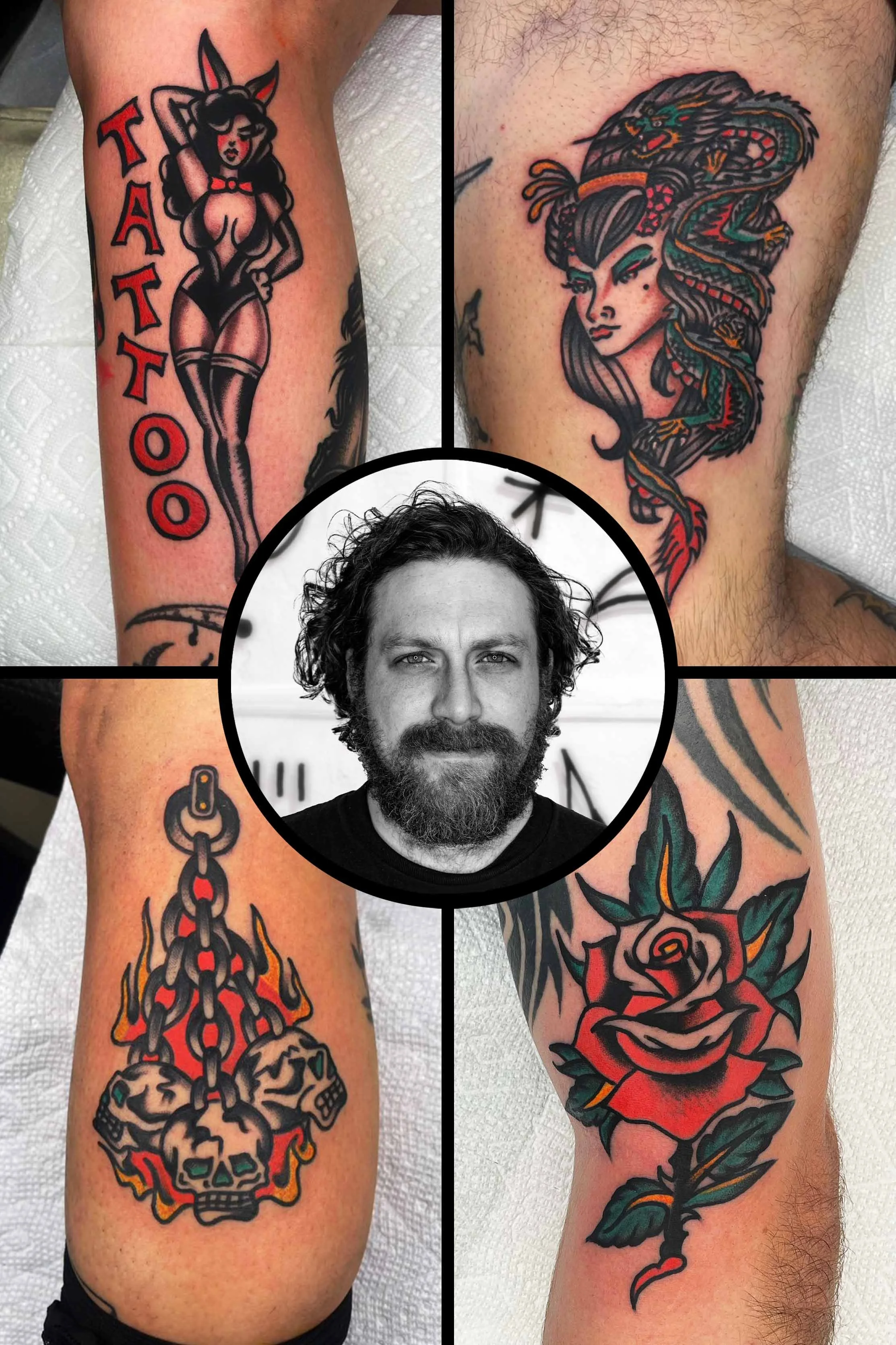 Tim Sosler specializes in American Traditional tattoos and holds close to the tattoo traditions of creating their own hand-painted flash, delivering bold and colorful designs, and living by the sword of the coil. Check out their original flash book below or book your own custom piece today!